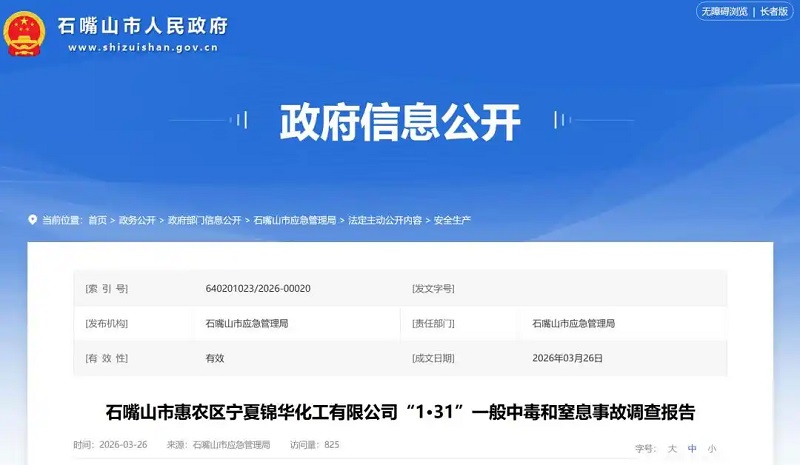 2026年1月31日7时40分许,位于宁夏回族自治区石嘴山市的宁夏锦华化工有限公司发生一起中毒和窒息事故,致2人死亡,直接经济损失304.24万元。近日,宁夏回族自治区石嘴山市应急管理局公布该起事故调查报告。