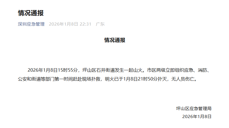 2026年1月8日15时55分,坪山区石井街道发生一起山火。市区两级立即组织应急、消防、公安和街道等部门第一时间赶赴现场扑救,明火已于1月8日21时50分扑灭,无人员伤亡。