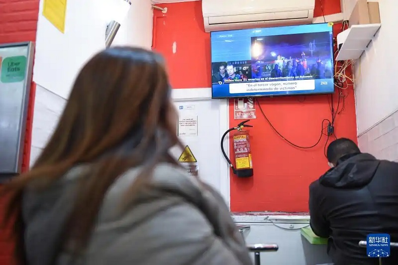 1月19日,人们在西班牙马德里一家餐厅内观看高铁脱轨相关新闻。新华社发(古斯塔沃·巴连特 摄)