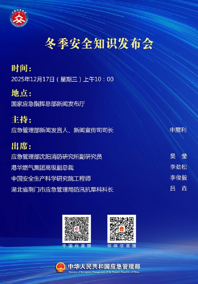 应急管理部定于12月17日(星期三)上午10时在国家应急指挥总部新闻发布厅举行冬季安全知识发布会,通报近期安全防范工作部署,介绍冬季有关安全知识并答记者问。应急管理部新闻发言人、新闻宣传司司长申展利主持,应急管理部沈阳消防研究所副研究员吴莹、港华燃气集团高级副总裁李劲松、中国安全生产科学研究院工程师李俊毅、湖北省荆门市应急管理局防汛抗旱科科长吕垚出席。